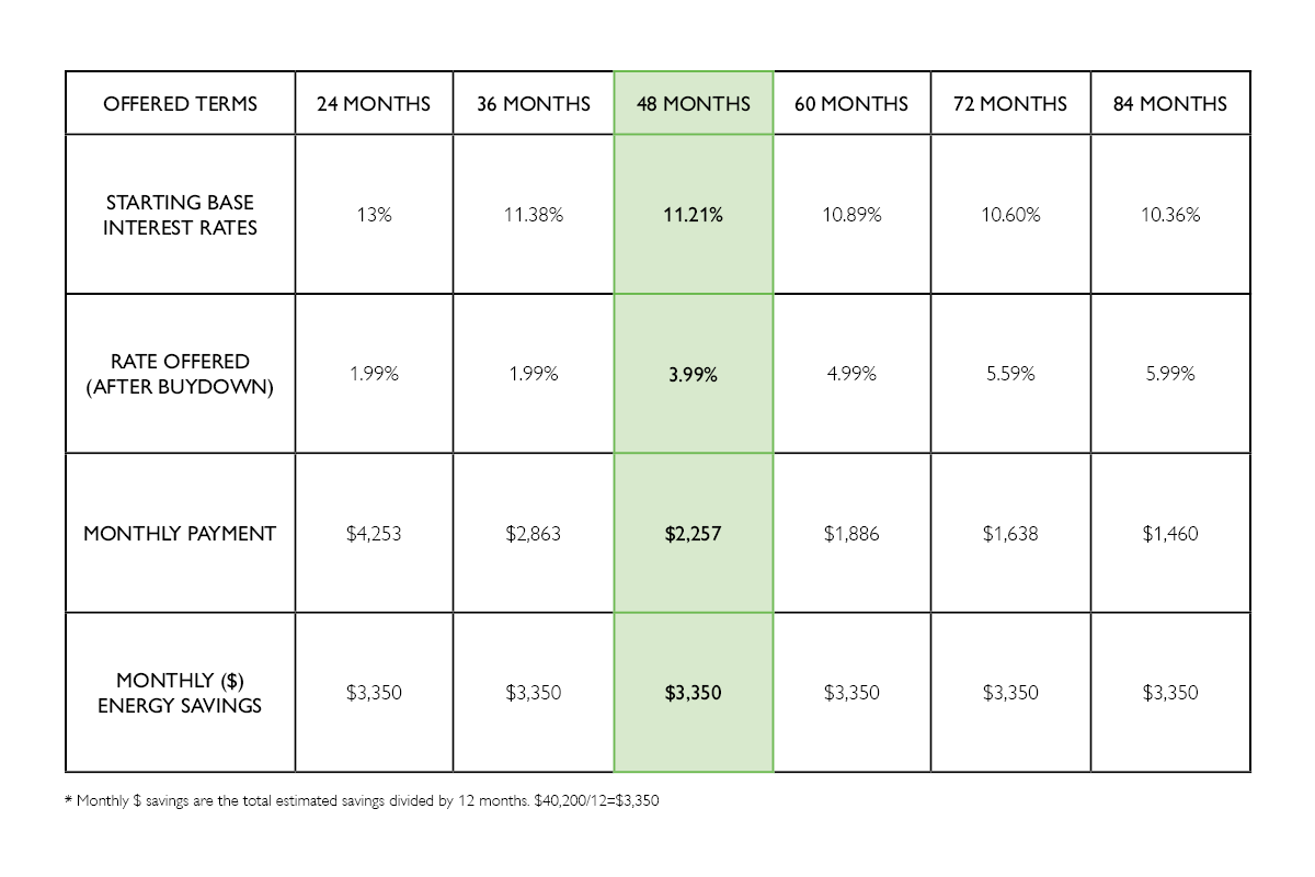 For the 48-month term, the estimated monthly energy savings covers the monthly loan repayment.