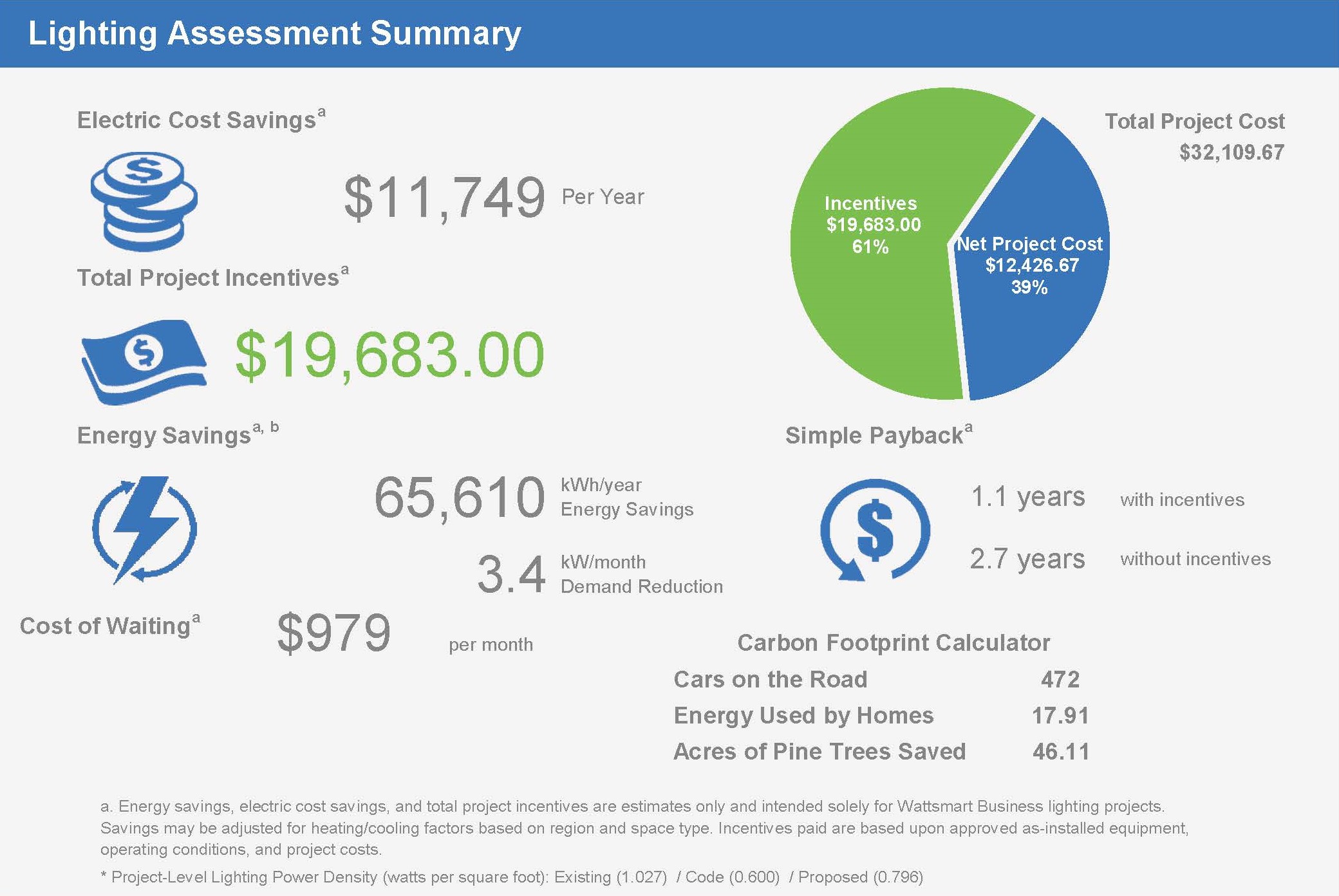 - $0 down** on a lighting upgrade with Wattsmart incentive and low-cost financing.